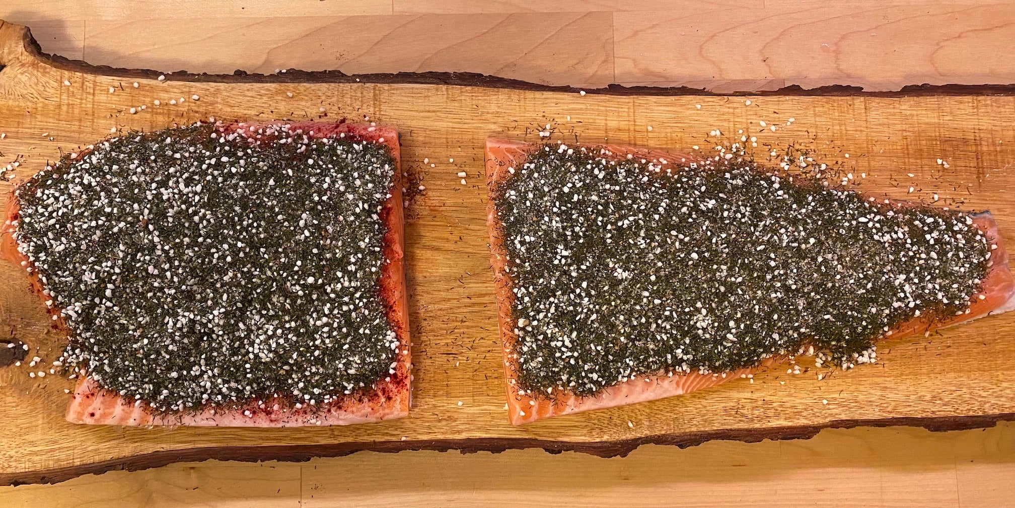 Die Gewürzmischung auf dem gesamten Lachs verteilen.