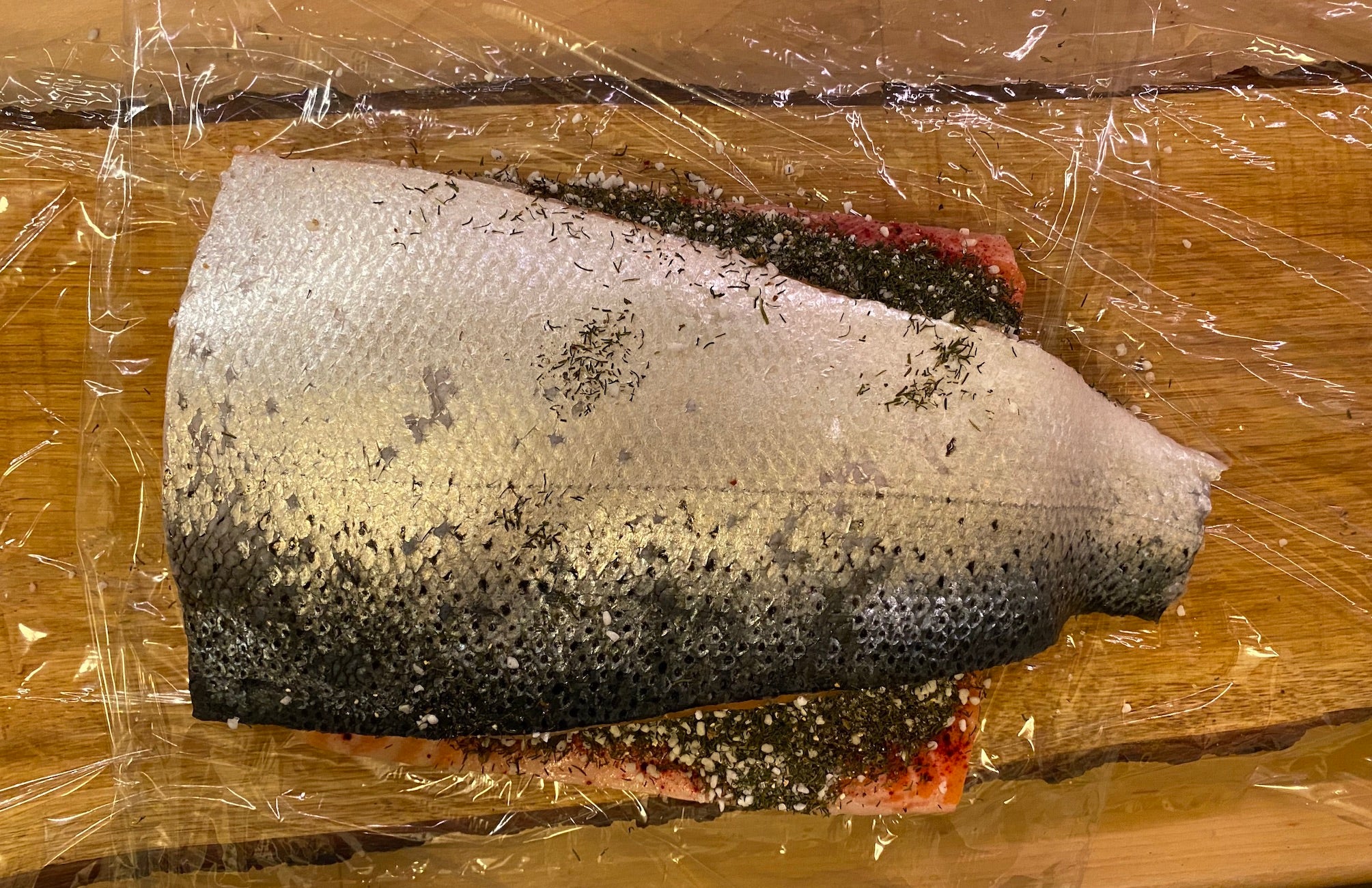 Die beiden Lachseiten aufeinander legen und die beiden Teile fest in Klarsichtfolie einwickeln.