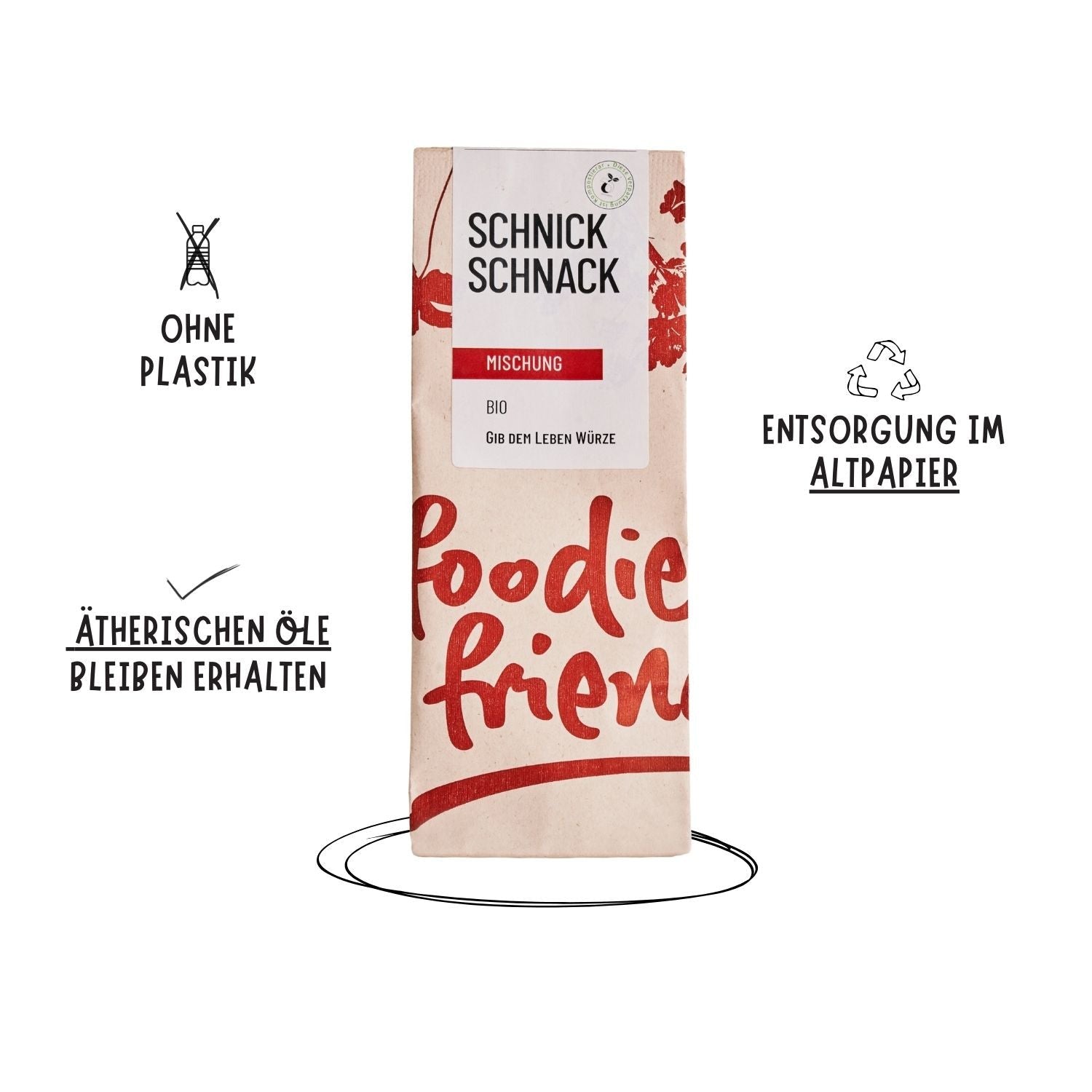 Die BIO Schnick Schnack Gewürzmischung kombiniert Basilikum, Rosmarin, Bärlauch, Thymian, Oregano, Estragon, Knoblauch & Lorbeer – alles aus kontrolliert biologischem Anbau. Ob für Fleisch, Gemüse, Suppen oder Dips – diese vielseitige Kräutermischung verleiht jedem Gericht eine aromatische Note. Probier’s aus und bring Abwechslung in deine Küche! 🌱