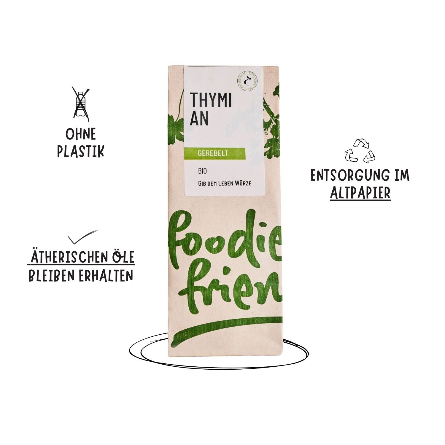 Thymian ist für sein starkes, würziges Aroma und seinen leicht bitteren Geschmack bekannt. Es wird häufig in der mediterranen Küche verwendet und ist ein beliebtes Gewürz für eine Vielzahl von Gerichten, darunter Suppen, Eintöpfe, Saucen, Fleischgerichte, Fischgerichte und Gemüse.